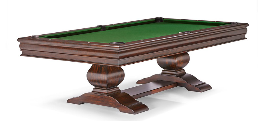 Table size: 8 ft., 9 ft. Finishes Available: Deep Madeira Leg Options: Unique, Standard Rail Sights: Diamond-Shaped White Pearlized Pocket: Enclosed