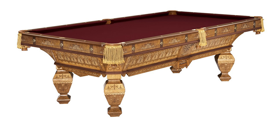 Brunswick Billiards has chosen to revive the Exposition Novelty in a limited edition of 25 tables to celebrate and honor its 165th anniversary. Each table includes a limited edition matching cue rack and cue. This table's heritage design speaks to a bold era of art and culture in America and around the world. Its elegance finely represents how Brunswick has been connecting generations of billiard enthusiasts throughout its 165-year history.